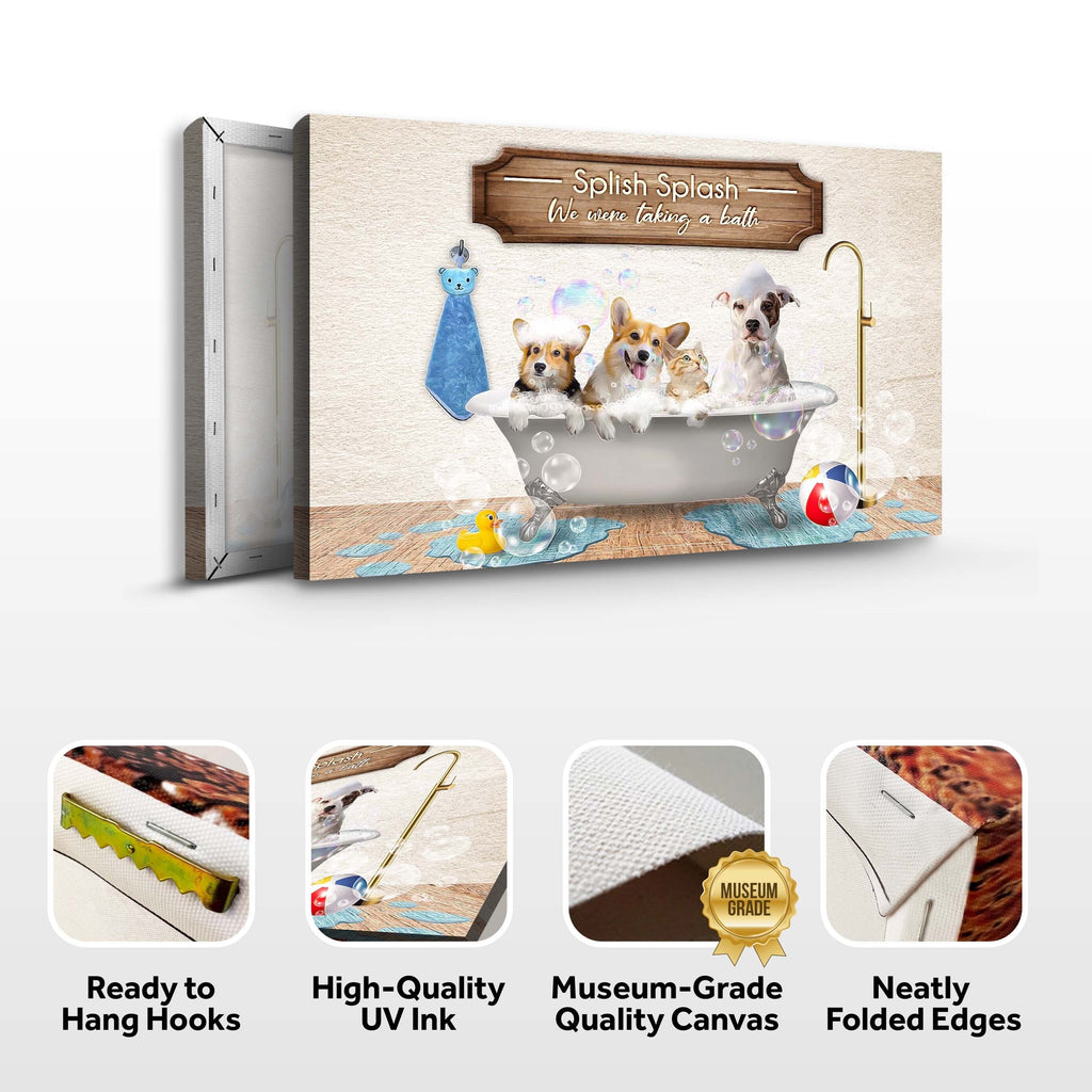 Are you ready to take a bath? This cute Splish Splash We Were Taking a Bath canvas wall art is ready to help your boring bathroom and make your bath times more enjoyable! This design looks great in any home, featuring playful pets enjoying their bath in the tub.