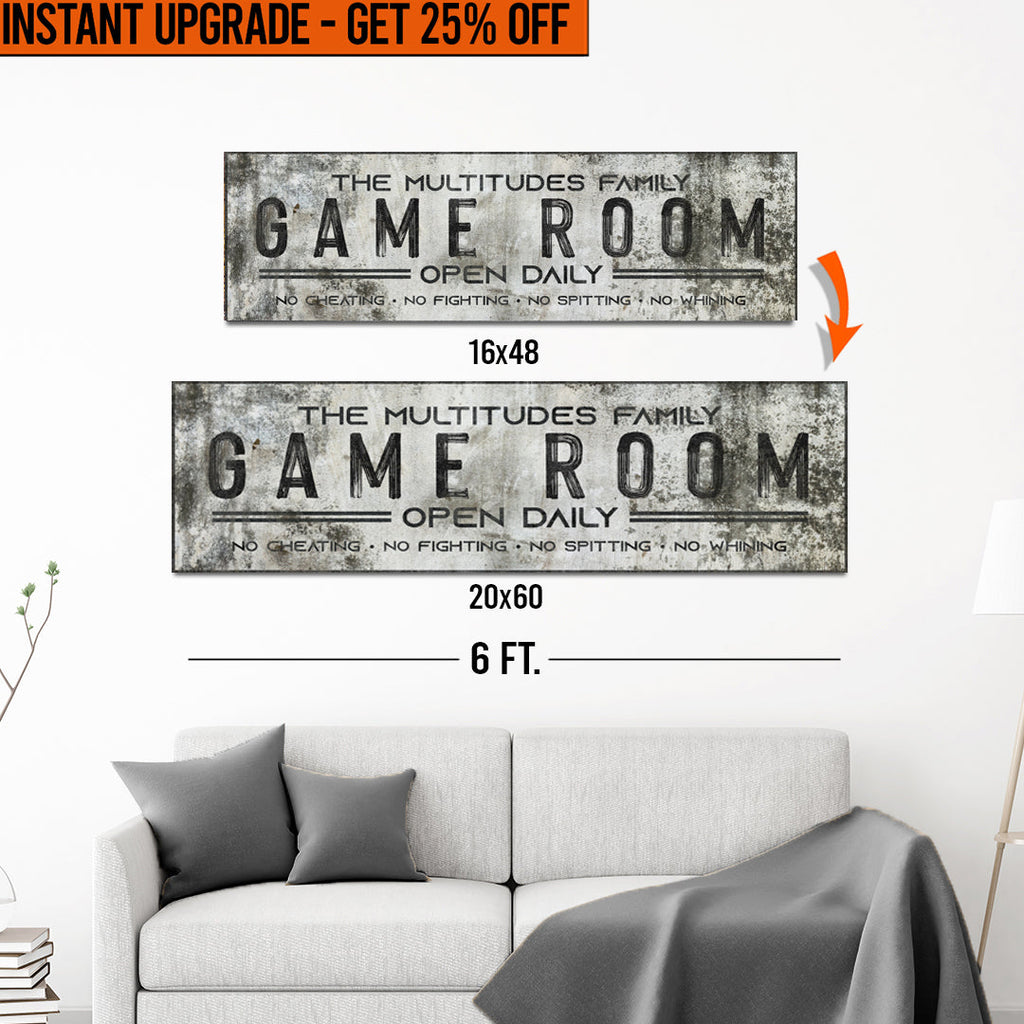 - This Upgrade Your 16x48 Inches 'Family Game Room' (Style 2) Canvas To 20x60 Inches sign is custom-made just for you. Get it with your family name, or change the other text to something that suits you - so YOUR home will tell YOUR family story.