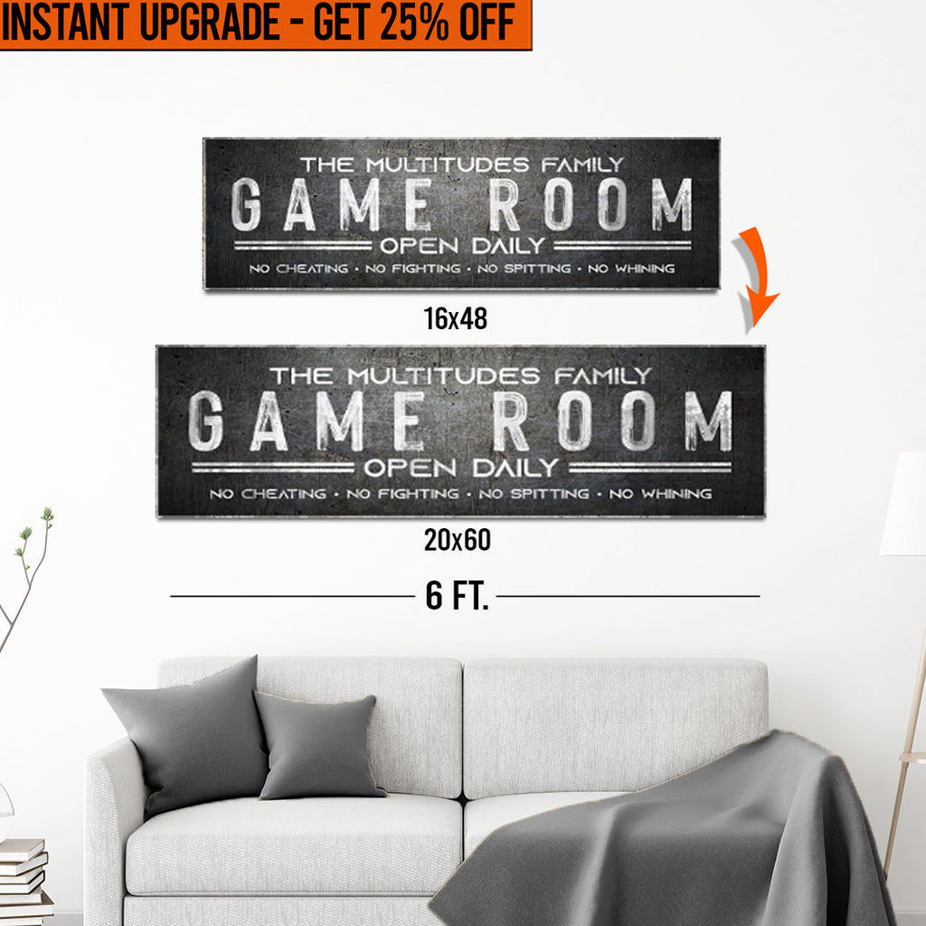 - This Upgrade Your 16x48 Inches 'Family Game Room' (Style 3) Canvas To 20x60 Inches sign is custom-made just for you. Get it with your family name, or change the other text to something that suits you - so YOUR home will tell YOUR family story.