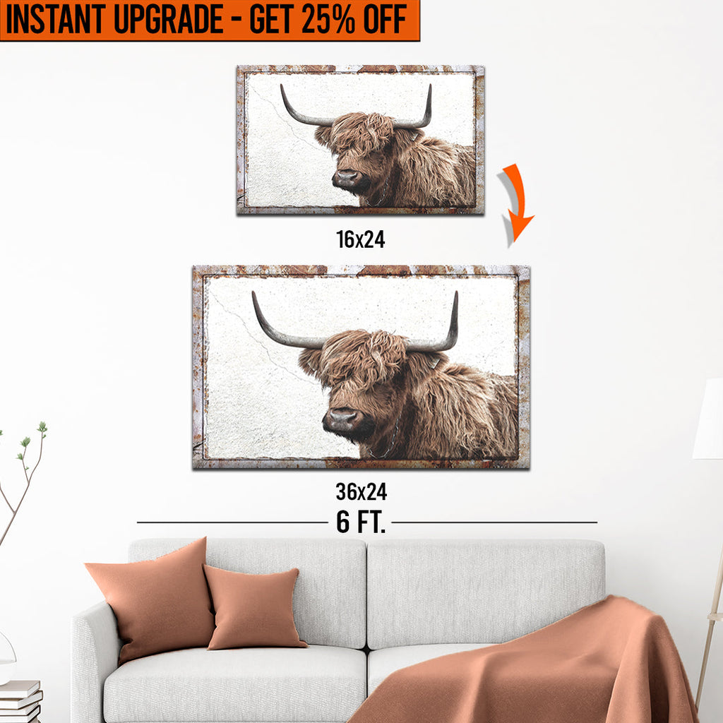 Upgrade the look of your space with a larger 'Natural Rustic Highland Cow' canvas. Measuring 36x24, this wall canvas is sure to transform any indoor/outdoor atmosphere into an oasis designed for your friends and family to gather, relax and make lasting memories. Not only will expanding the size create greatly improved aesthetics, but it will also help add personality and depth of feeling throughout the room. Upgrade today and start living in maximum comfort without ever leaving home again!