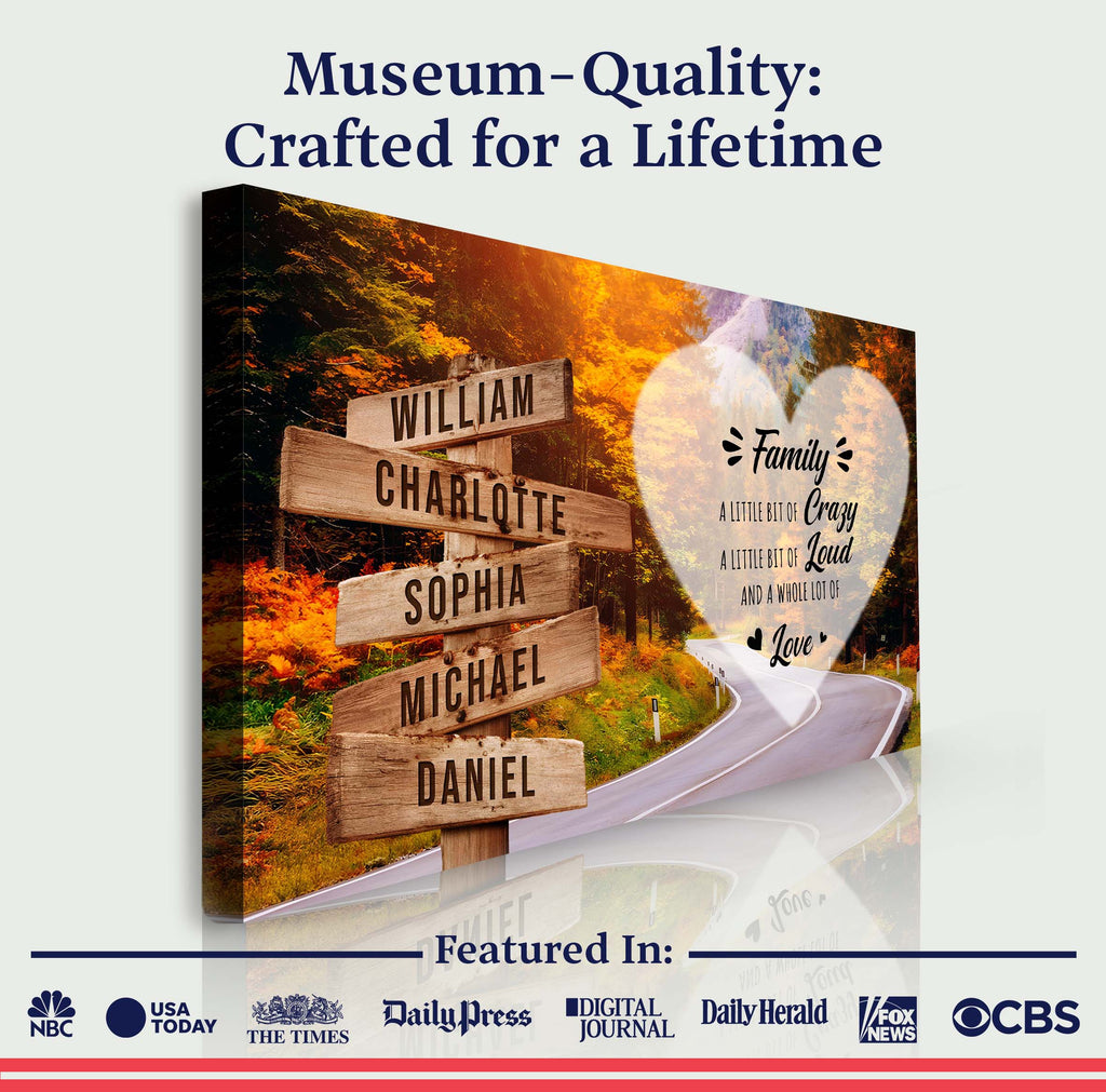 You can customize the Family Names canvas print with your choice of words and names, as well as the image you want in the background. The fonts used and the color scheme are also customizable, so you can have something entirely different.