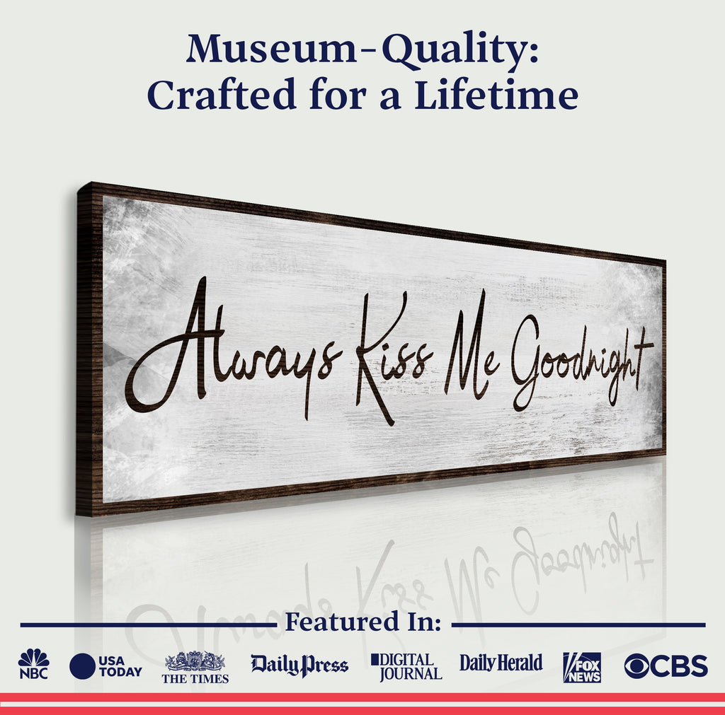 Always kiss me goodnight — what a sweet and simple way to remind your loved one how important they are to you. This Always Kiss Me Goodnight sign is the perfect addition to any bedroom. The Always Kiss Me Goodnight wall art is made of high-quality wood and painted with black and white letters. It's the perfect size for hanging on the wall or placing it on a nightstand. Whether you're looking for a romantic gift for your anniversary or a sweet way to show your love, this Always Kiss Me Goodnight canvas wall art is sure to please.
