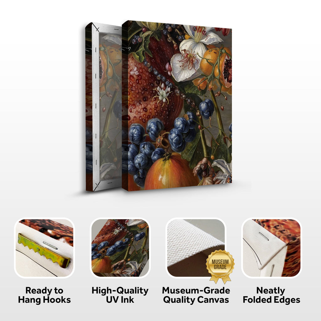 Immerse yourself in the beauty of "Baroque Bounty" from the renowned artist. This exquisite canvas features a vibrant array of fruits and flowers, bringing a touch of classic elegance and rich detail to your home. Perfect for adding a sophisticated focal point to any room, this piece celebrates the abundance and beauty of nature.