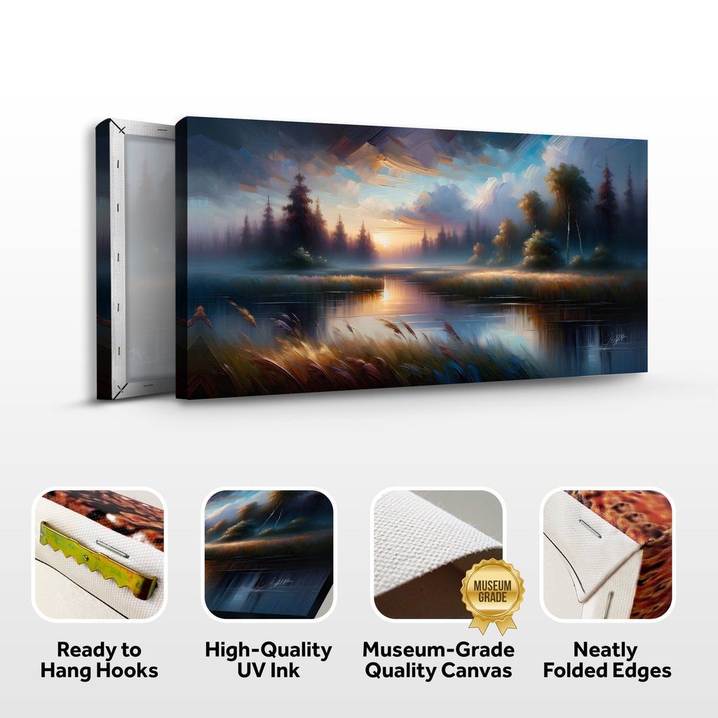 Immerse your home in the serene beauty of a tranquil dusk scene. This captivating artwork from Steven's collection features soft, dreamy hues and a peaceful lakeside view, creating a calming and reflective atmosphere. Perfect for adding a touch of elegance and tranquility, it transforms any room into a serene retreat, inviting relaxation and contemplation.