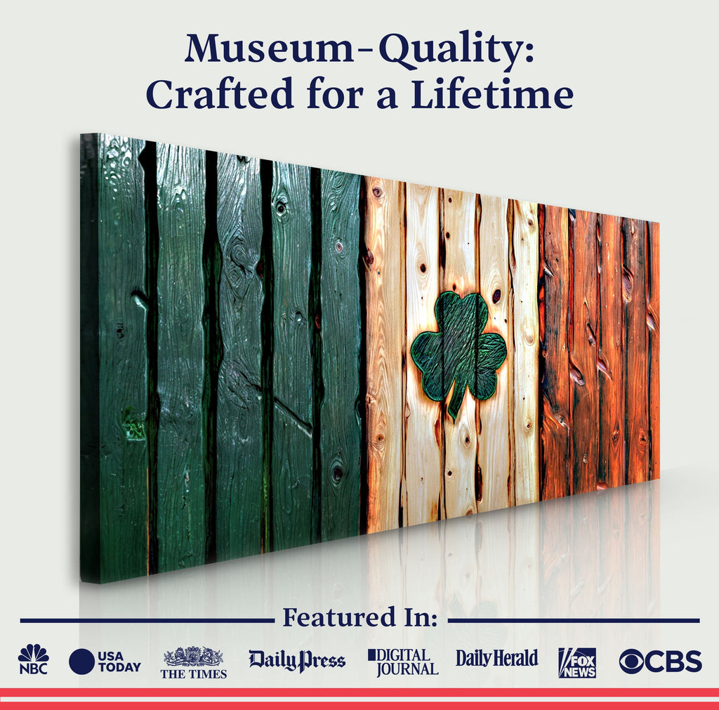 Celebrate Irish pride and tradition with this stunning canvas wall art, featuring the Irish flag colors in a rustic wooden design, beautifully accented by a classic shamrock symbol in the center. This piece exudes a warm, vintage charm, making it a perfect addition to any home, pub, or space that embraces Irish culture.