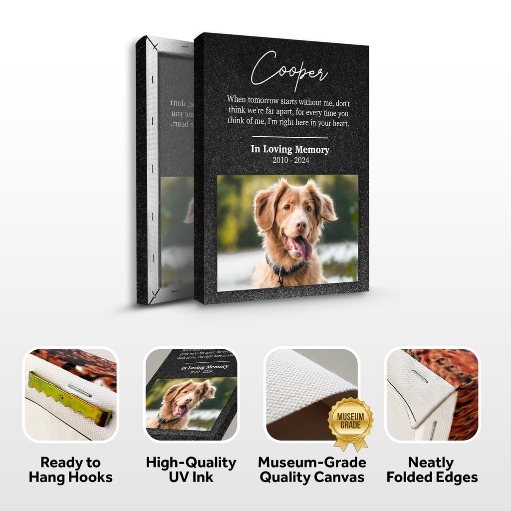 Let the memory of your beloved family member live on with this custom dog memorial pet loss frame portrait. Take comfort in the elegant wood patterns that will complement any photo canvas for any home décor style. Hang this passing gift in your pet's favorite room as a fitting tribute to the happy memories that you once shared.