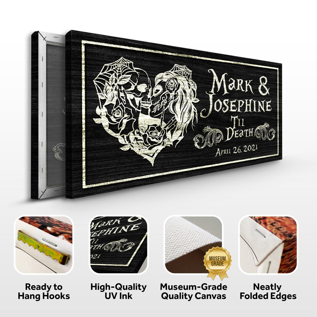Till Death Do Us Part Skeleton Couple sign is the perfect way to show your love for skeletons and your other half. You can customize the sign by choosing from three sizes. The Till Death Do Us Part Skeleton Couple wall art is made of high-quality and durable materials. The Till Death Do Us Part Skeleton Couple canvas print is a great way to show your love for skeletons and your other half. You can display the Till Death Do Us Part Skeleton Couple canvas wall art in your home or office. The Till Death Do Us Part Skeleton Couple sign makes a great gift for skeleton lovers and fans of Till Death do us part.