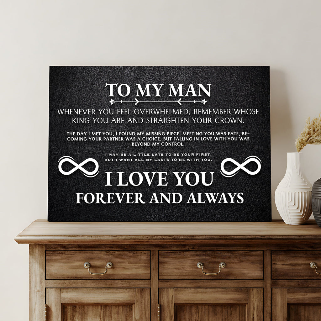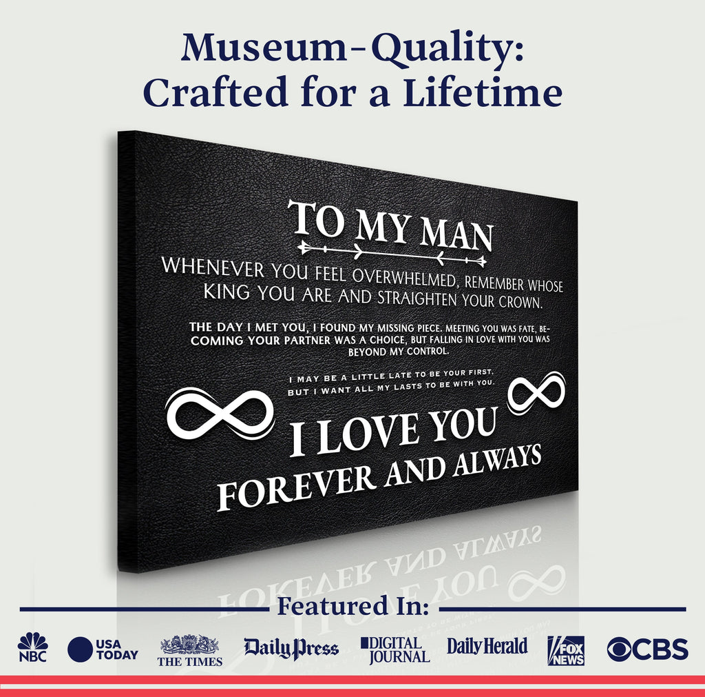 Celebrate your husband with this "To My Man" canvas, a beautiful gift that captures your love and appreciation. Featuring a touching message and customizable name, it’s the perfect way to remind him how much he means to you. Ideal for anniversaries, birthdays, or just because, this artwork adds a personal and emotional touch to your home, making your husband feel truly cherished and loved daily.