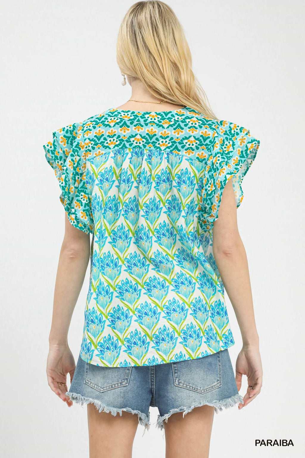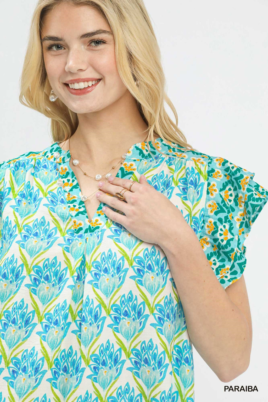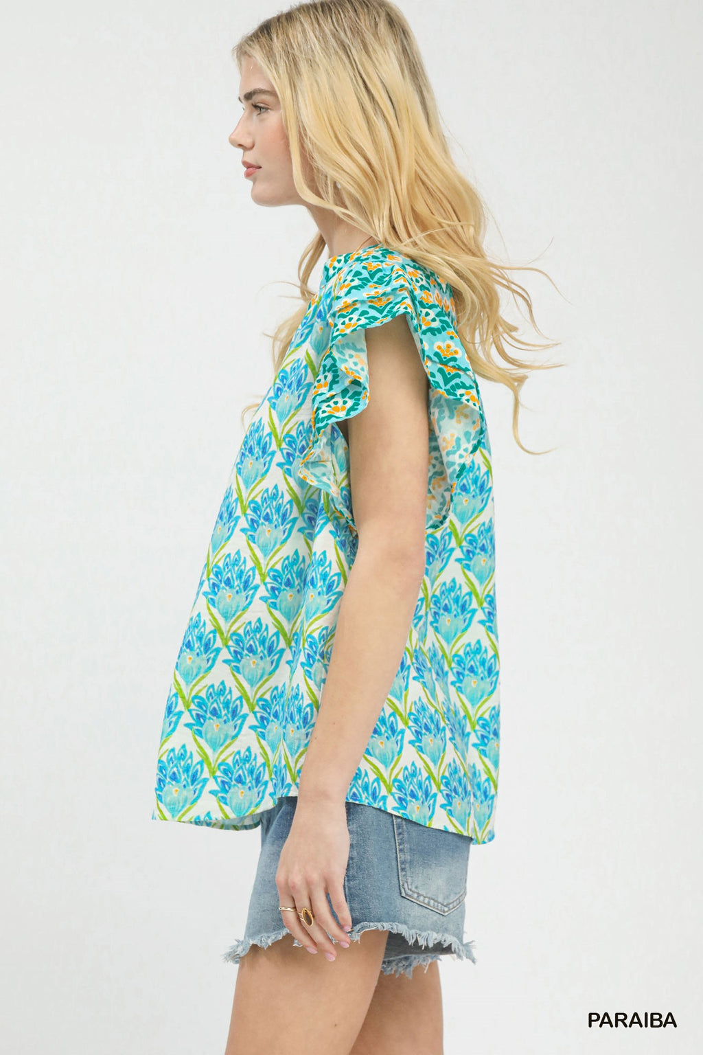 This floral print top features a hand-block inspired floral pattern, a flattering V-neckline, and charming double frill sleeves, while its boxy, relaxed fit and unlined design deliver an artistic, vacation-ready style that’s lightweight, comfortable, and effortlessly easy to wear for any casual occasion.