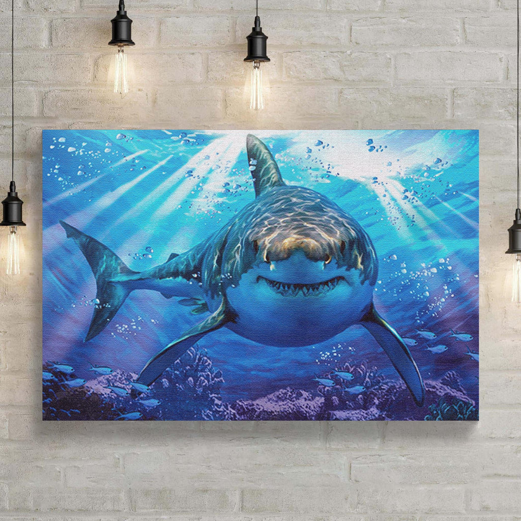 Underwater White Shark Canvas Art would look great in any space where you want to make a statement: on your living room wall, above the mantel of your fireplace, or even outside on your patio or deck, if you have one! It's versatile enough that it could work anywhere but bold enough that it won't get lost among other pieces of art.
