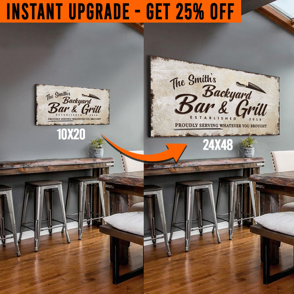 - This Upgrade Your 'Backyard Bar and Grill' (Style 3) Canvas To 24x48 Inches sign is custom-made just for you. Get it with your family name, or change the other text to something that suits you - so YOUR home will tell YOUR family story.