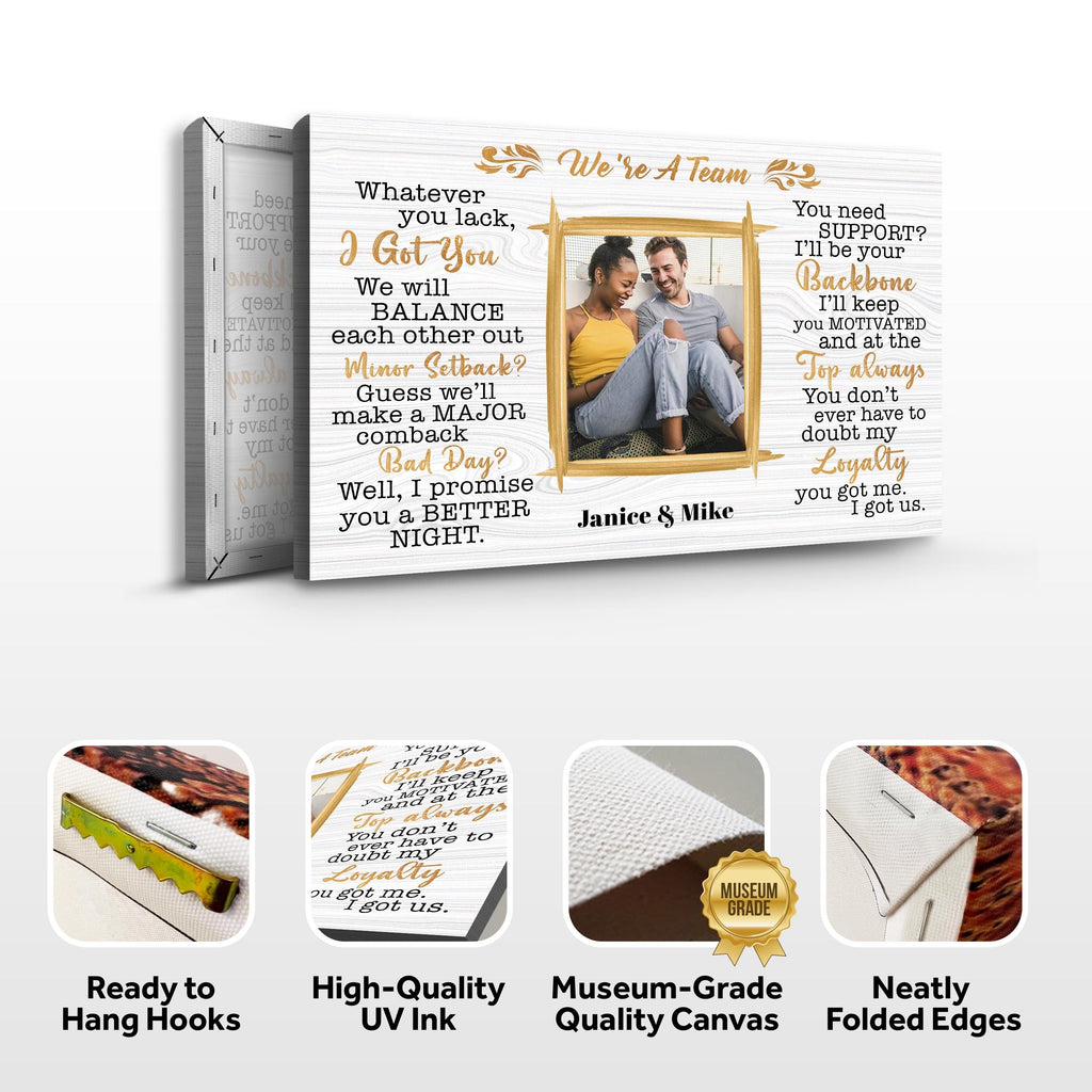 We're A Team Couple Signs are a great way to remind your other half how lucky you are to have them in your life. This We're A Team Couple Sign is a beautiful canvas wall art that is sure to brighten up any room. The sign reads "We're A Team" and is surrounded by a heart. This We're A Team Couple Sign print is perfect for any couple who wants to remind each other how lucky they are to be together. Custom couple signs are a thoughtful and unique way to show your partner how much you love and appreciate them. Order your We're A Team Couple Sign wall art today!